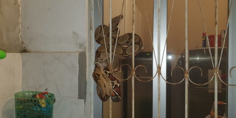 Policiais militares do Comando de Policiamento Ambiental (CPAMB), por meio do Batalhão de Policiamento Ambiental (BPAMB), na madrugada desta sexta-feira (23/08), efetuaram o resgate de uma jiboia que se encontrava numa residência no conjunto Atílio Andreazza, no bairro Japiim, zona sul de Manaus.