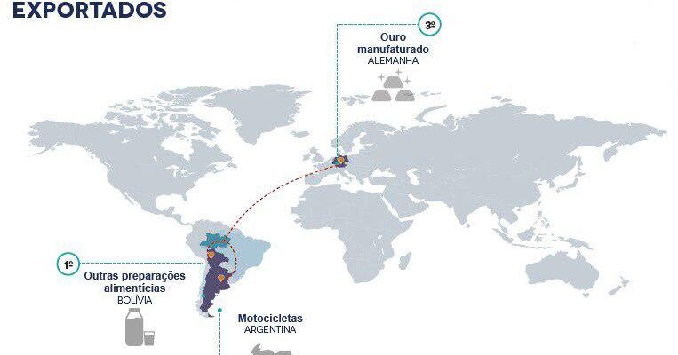O item “motocicletas” foi o segundo produto mais exportado em janeiro de 2021, registrando o volume de US$9,37 milhões, o equivalente a 13,02% do total exportado. A Argentina foi responsável por 58,44% das aquisições deste produto. Já o item “ouro manufaturado” foi o terceiro produto mais exportado no período com US$8,70 milhões, o equivalente a 12,09% do exportado, sendo a Alemanha o principal destino de 100% do item produzido no Amazonas.