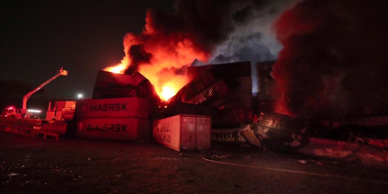 Segundo os relatos, uma explosão ocorreu depois que um dos contêineres foi atingido por uma descarga atmosférica (raio). À frente dos 16 contêineres, que foram rapidamente tomados pelo fogo, havia 11 tanques com armazenamento de produtos químicos perigosos, que ofereceram grande risco de explosão durante às primeiras 14 horas de combate, quando as chamas estavam intensas na área confinada. Ao menos 35 contêineres estavam dispostos na área mais quente.