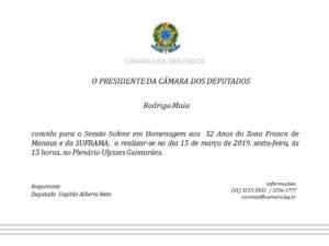 O Deputado Federal Capitão Alberto Neto (PRB-AM) solicitou à presidência da Câmara uma sessão em homenagem por reconhecer a importância da autarquia para a Amazônia Ocidental. Para o parlamentar, a Suframa precisa ter reconhecimento nacional por sua grande colaboração para economia brasileira, sobretudo, do Amazonas.