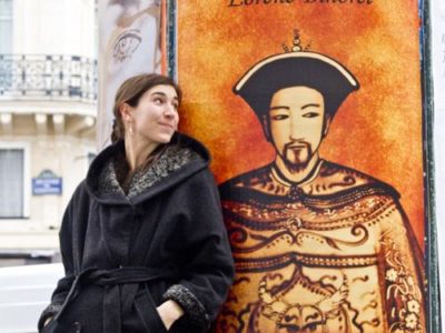 Artista francesa conta histórias ao criar desenhos na areia, no palco do Teatro Amazonas