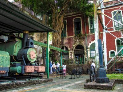 Entre peças de navegação de ferro fundido, máquinas de eletricidade, tijolinhos, a beleza do patrimônio e com a vista perto do rio Negro, ...