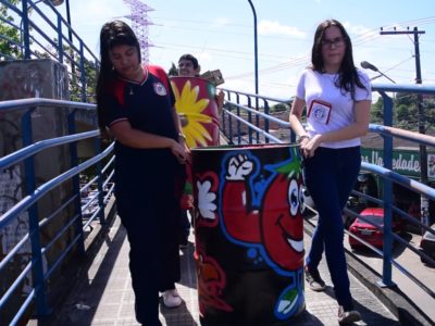 Estudantes realizam ação ambiental com lixeiras em terminal de ônibus na Cidade Nova