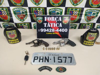 Policiais militares da Força Tática apreenderam duas armas de fogo, munições e um veículo modelo Siena de placas PHN-1577, que havia acabado de ...