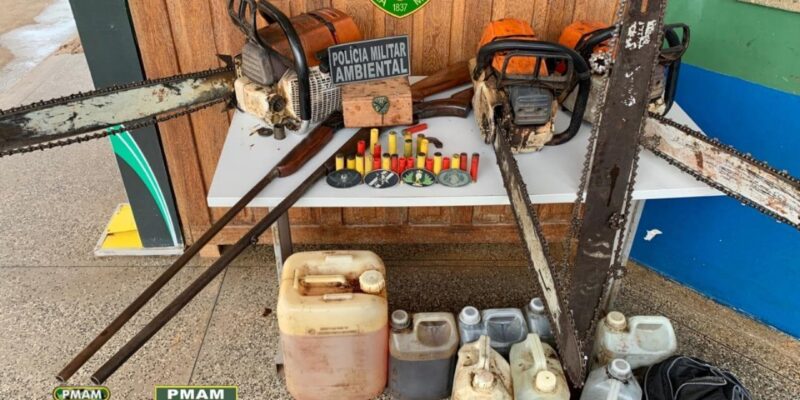 A equipe recebeu denúncia informando que um homem armado estaria realizando desmatamento e comercializando madeira na região. Os policiais foram ao local indicado e na abordagem ao suspeito, apreenderam uma espingarda calibre 20, contendo 10 cartuchos recarregáveis; quatro cartuchos deflagrados; além de uma espingarda calibre 28 com cinco cartuchos intactos, quatro cartuchos recarregáveis e dois cartuchos deflagrados.