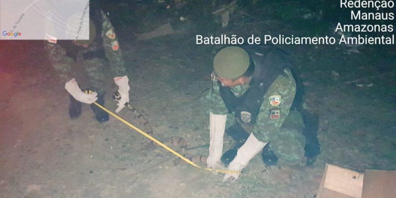 O Comando de Policiamento Ambiental (CPAMB) da Polícia Militar do Amazonas (PMAM), por meio do Batalhão de Policiamento Ambiental (BPAMB), realizou na noite da terça-feira (13/08) o resgate de uma cobra jiboia (Boa constrictor) adulta, de aproximadamente 1,3 metro de comprimento, que estava no quintal de uma residência no bairro Jorge Teixeira, zona leste da capital.