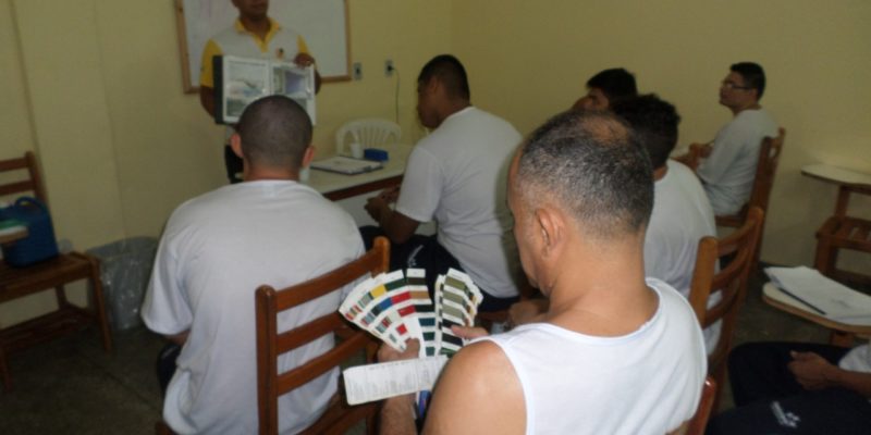 Presos do Centro de Detenção Provisória Masculino (CDPM) estão recebendo aulas de pintura predial. O curso tem carga horária de 160 horas – com previsão de término em junho – e aborda conhecimentos teóricos e práticas que vão desde como fazer o orçamento de pintura de obras ou revestimentos de interiores, noções de segurança no trabalho e higiene, a preparar superfícies para acabamento e aplicar tintas e revestimento; além de serem preparados também para aplicar pinturas mais sofisticadas, como textura, marmorização e grafiato, consideradas um diferencial para os profissionais.