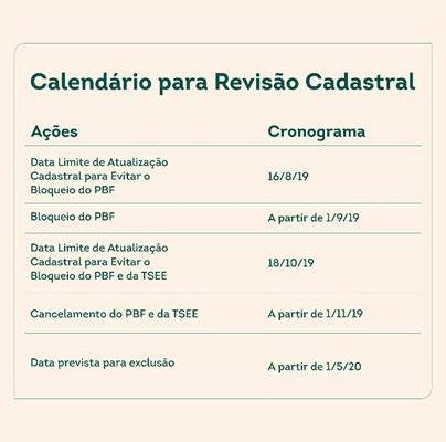 O governo federal realiza a notificação por meio do extrato bancário e carta. A revisão cadastral deve ser efetuada para evitar o bloqueio dos benefícios. O mesmo prazo limite é também para o Grupo 5 e 6 da averiguação cadastral.
