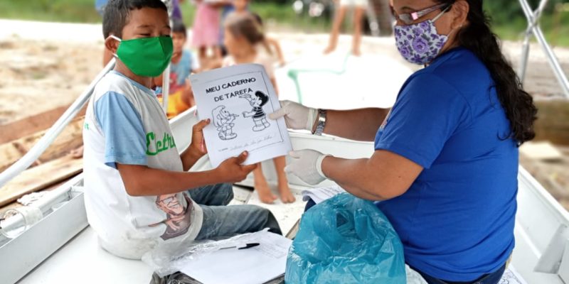 Para manter o cronograma do conteúdo escolar estabelecido aos alunos da educação básica durante a pandemia provocada pelo novo coronavírus, a Prefeitura de Manaus realizou a entrega de apostilas a alunos da escola municipal Raimunda Brasil, localizada na comunidade Santa Isabel, no rio Negro, zona rural de Manaus.
