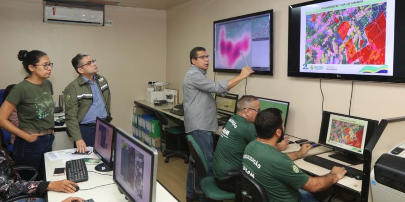 O trabalho de detecção dos responsáveis por desmatamento é realizado em conjunto com técnicos da Secretaria de Estado do Meio Ambiente (Sema), na Sala de Situação instalada no prédio da secretaria. O espaço permite monitoramento de nível dos rios, pluviométrico e de desmatamento.