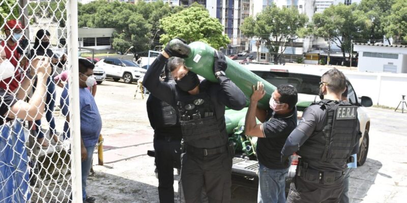 A Polícia Civil do Amazonas cumpriu, na manhã deste sábado (16/01), decisão judicial que determinou a busca e apreensão de cilindros de oxigênio nas instalações da White Martins e entrega do insumo à Sociedade Portuguesa Beneficente do Amazonas. A operação foi conduzida pelo Grupo Força Especial de Resgate e Assalto (Fera) e retirou da empresa 14 cilindros para abastecerem os leitos do hospital.