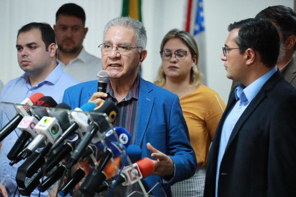 Onze deputados estaduais participaram, ao lado do governador do Amazonas, Wilson Lima, de coletiva de imprensa na sede do governo para falar sobre a situação do hospital Francisca Mendes.