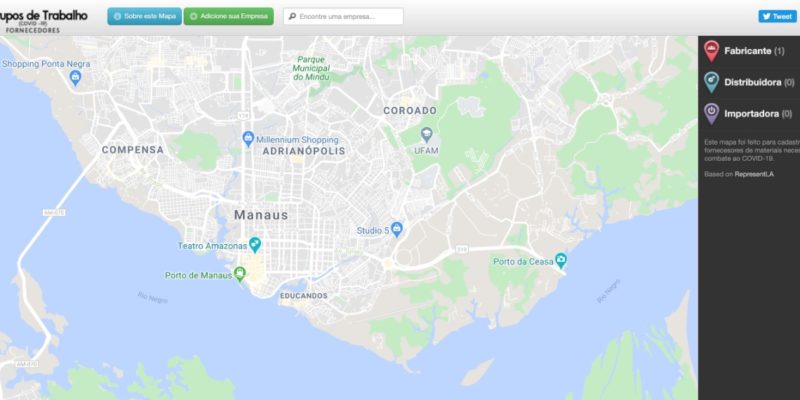 Em parceria com a Secretaria de Estado de Desenvolvimento Econômico, Ciência, Tecnologia e Inovação (Sedecti), a Associação Polo Digital de Manaus (APDM) elaborou um mapa construído a partir da plataforma RepresentMap (projeto de código aberto que ajuda comunidades no mundo a criarem seus próprios mapas), para servir de ferramenta e direcionar na busca por fornecedores de insumos que podem ajudar no enfrentamento ao novo coronavírus (Covid-19) no Amazonas.