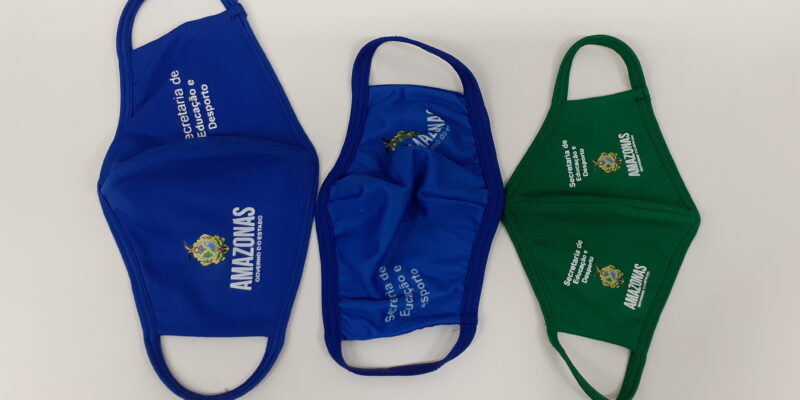 Os modelos azuis são para servidores da educação e estudantes de Ensino Médio, com tamanhos M e G. As máscaras de modelo verde, de tamanho P, serão distribuídas aos alunos do Ensino Fundamental, que somente retornam às atividades no próximo dia 24 de agosto.