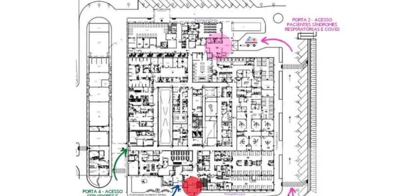 A porta 1, na entrada da frente do hospital, será destinada a pacientes que não apresentam sintomas de Covid-19, como urgências clínicas e cirúrgicas, acidentes, ferimentos, traumas, entre outras situações. Já a porta 2, acessada pela parte posterior da unidade, onde já funciona a entrada da urgência e emergência, será exclusiva para pacientes com Síndromes Respiratórias Agudas Graves (SRAGs), incluindo a Covid-19.