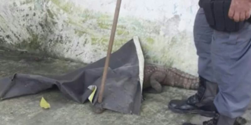 Jacaré é capturado passeando na calçada, em Manaus