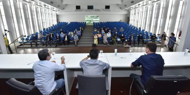 O prefeito David Almeida e o vice-prefeito, Marcos Rotta, se reuniram no segundo dia do mandato com o seu secretariado, para traçar as metas dos primeiros 100 dias de gestão. Para garantir o distanciamento social, o encontro aconteceu no início da noite deste sábado (2/1), no auditório da sede da Prefeitura Municipal de Manaus – na avenida Brasil, zona Oeste da capital.