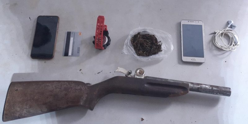 Durante patrulhamento, os policiais realizaram a abordagem ao grupo que estavam em atitude suspeita, em um terreno baldio. Na ação foram encontrados uma porção de maconha e um simulacro de espingarda.
