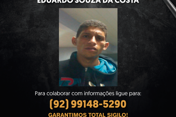 A Polícia Civil do Amazonas, por meio do delegado Guilherme Torres, titular da Delegacia Especializada em Roubos, Furtos e Defraudações (Derfd), solicita a colaboração de todos na divulgação da imagem de Eduardo Souza da Costa, 24, autor do latrocínio do empresário do ramo de confecções Yann Victor Fonseca Rios, e de tentativa de latrocínio do cunhado de Yann, um jovem de 22 anos. A vítima fatal tinha 21 anos.
