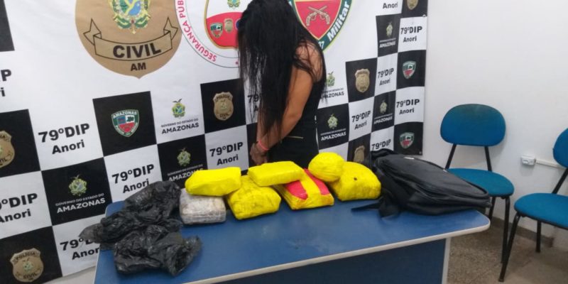 A Polícia Civil do Amazonas, por meio da equipe de investigação da 79ª Delegacia Interativa de Polícia (DIP), situada em Anori, prendeu, em flagrante, na tarde de quinta-feira (16/05), por volta das 16h, naquele município, distante 195 quilômetros em linha reta da capital, Maisa dos Santos Cruz, 24, com oito quilos de drogas, sendo cinco quilos de maconha do tipo skunk e três quilos de oxi.
