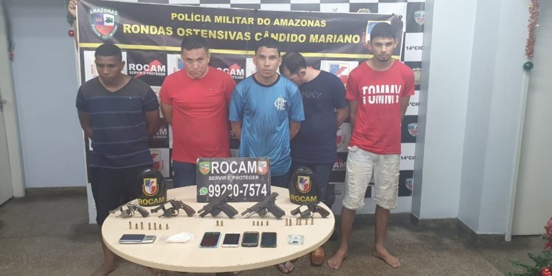 Policiais militares da Rondas Ostensivas Cândido Mariano (Rocam) detiveram, por volta das 21h30 de sexta-feita (27), cinco homens, todos maiores de idade, entre 22 a 31 anos, por posse de arma e entorpecentes.