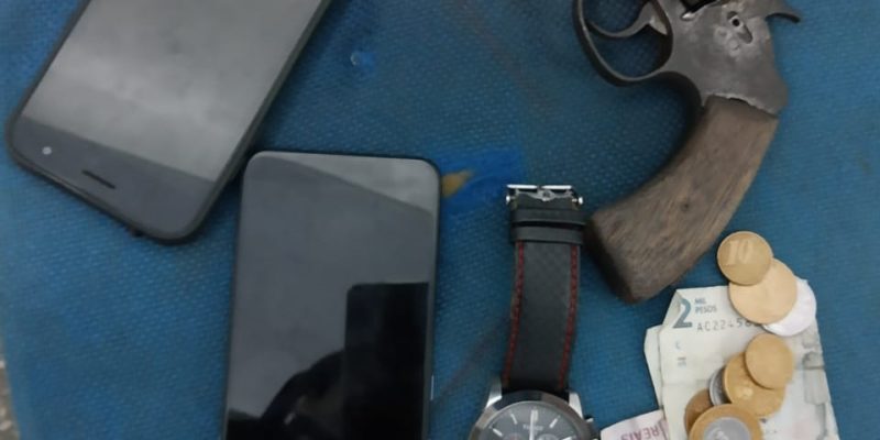 As equipes realizaram a abordagem a um homem em atitude suspeita, e com ele foi encontrado um revólver calibre 32, com duas munições, sendo uma deflagrada e outra intacta. Também foram apreendidos dois aparelhos celulares que haviam sido roubados. Logo em seguida, as vítimas do roubo chegaram ao local e reconheceram o suspeito.