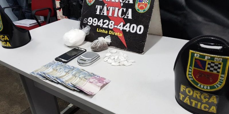 Policiais militares da Força Tática detiveram, na tarde deste domingo (06/10), um homem de 24 anos suspeito de tráfico de drogas no bairro Cachoeirinha, zona sul da capital. Com ele, os policiais apreenderam uma porção média de supostamente maconha tipo skunk, uma porção de supostamente cocaína, 15 trouxinhas de supostamente cocaína, um celular Samsung, uma balança de precisão e a quantia de R$ 29 em espécie.