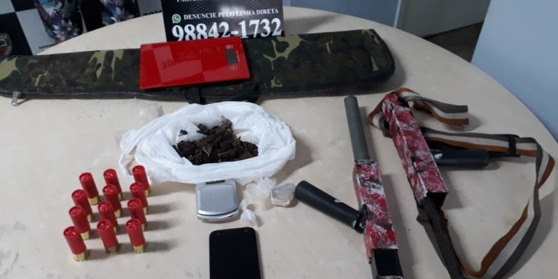 Policiais militares, por meio da 30ª Companhia Interativa Comunitária (Cicom), prenderam dois homens no bairro Jorge Teixeira, zona leste. Eles são suspeitos de cometerem crimes como tráfico de drogas e porte ilegal de arma de fogo. Uma arma caseira calibre 12, 12 munições intactas, cinco porções de entorpecentes, duas balanças de precisão e um aparelho celular foram apreendidos. Os infratores foram conduzidos ao 30º Distrito Integrado de Polícia (DIP).