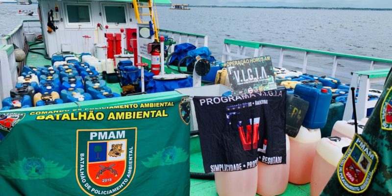 Em desdobramento da ‘Operação Hórus’, por volta das 11h30, durante patrulhamento fluvial nas proximidades da Manaus Moderna, a equipe avistou uma embarcação que estava armazenando de forma irregular galões com 5.840 litros de gasolina. Durante a abordagem, foi constatado que a embarcação possuía Licença para manuseio e transporte de produtos perigosos, mas oferecia acondicionamento indevido ao combustível. Ao lado da referida embarcação, a equipe identificou um segundo transporte fluvial do tipo Recreio, que mantinha de forma irregular, 500 litros de gasolina e 700 litros de óleo diesel no andar inferior.