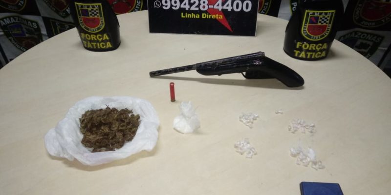 Policiais militares da Força Tática detiveram, na noite desta segunda-feira (06/04), um homem de 34 anos suspeito de tráfico de drogas e porte ilegal de arma de fogo no bairro Alvorada, zona centro-oeste da capital. Com ele os policiais apreenderam uma arma de fabricação caseira, calibre 36, uma munição calibre 36, intacta, uma porção média de supostamente cocaína, uma porção grande de supostamente maconha, 41 pedras de supostamente oxi, uma balança de precisão e um veículo modelo Gol de placas PHD-2725, sem documentação.