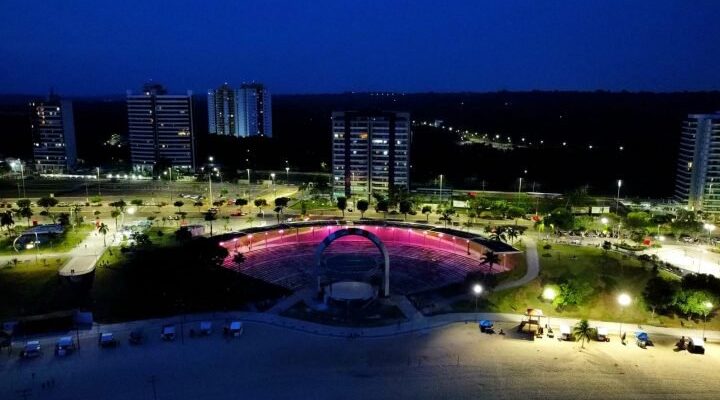 Em alusão ao “Outubro Rosa”, mês de combate e prevenção ao câncer de mama e colo de útero, o anfiteatro do complexo turístico Ponta Negra está iluminado com a cor da campanha para chamar a atenção da sociedade quanto à importância de falar sobre a doença.