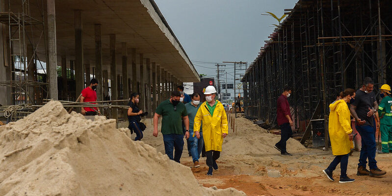 Sob chuva, o prefeito de Manaus, Arthur Virgílio Neto, vistoriou nesta quarta-feira, 21/10, o andamento da construção da estação Arena, na avenida Constantino Nery. Com 70% de execução, a estrutura tem previsão de entrega para 15 de dezembro, juntamente com a estação Santos Dumont, na avenida Torquato Tapajós.