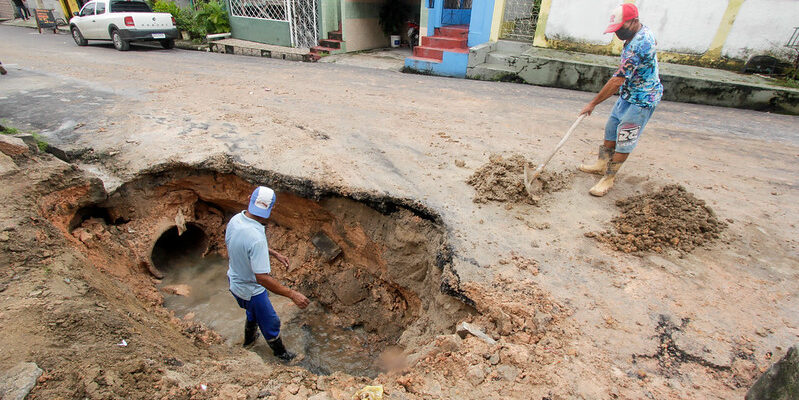 No Riacho Doce 2, bairro Cidade Nova, equipes da Seminf permanecem no local com os trabalhos de substituição da rede de drenagem profunda, na área externa da Unidade Básica de Saúde da Família 13 (UBSF13). Com o rompimento de uma tubulação, uma cratera se abriu no local durante a chuva em Manaus, na tarde da última sexta-feira (29). Ainda não há prazo definido para o término dos serviços. O vice-prefeito e secretário de obras de Manaus, Marcos Rotta, garantiu que a rede de drenagem será substituída com urgência.