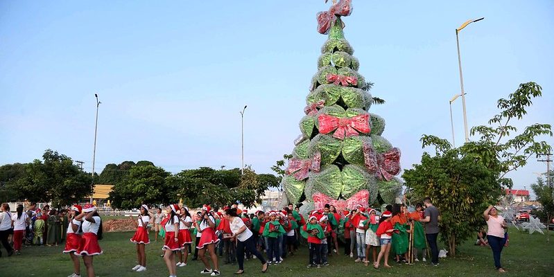 As luzes da grande árvore foram acesas pontualmente às 19h, após a apresentação do coral e da apresentação teatral dos alunos da escola municipal Lucila de Freitas, localizada na Colônia Santo Antônio.