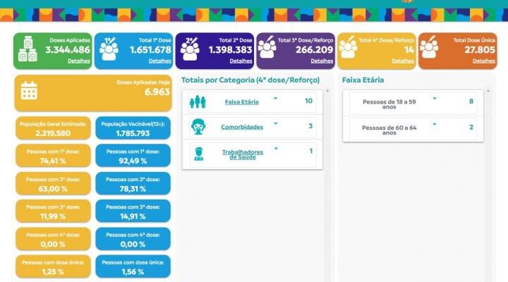 Desenvolvido pela equipe do Departamento de Tecnologia da Informação (DTI), da Semsa, sem nenhum custo para os cofres públicos, o Vacinômetro disponibiliza, por exemplo, o número de pessoas vacinadas por dose (se primeira, segunda, terceira e agora a quarta dose); os percentuais da imunização na capital – da geral estimada pelo Instituto Brasileiro de Geografia e Estatística (IBGE) e da vacinável (a partir de 12 anos); quantas pessoas foram vacinadas no dia.