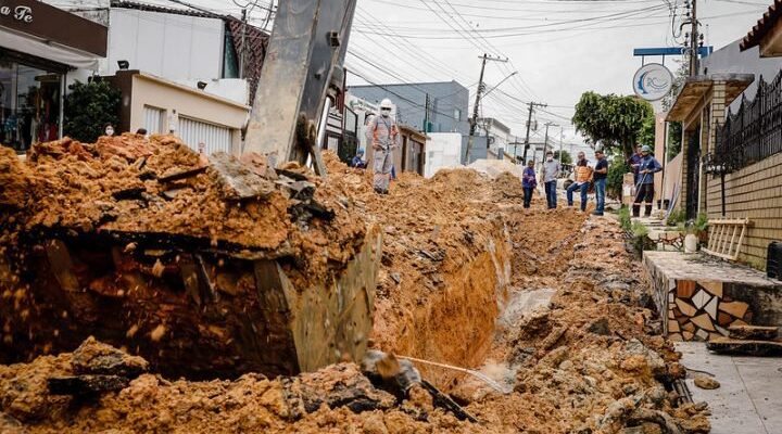 As equipes da Prefeitura de Manaus, por meio da Secretaria Municipal de Infraestrutura (Seminf), trabalham na substituição de uma rede de drenagem profunda com mais de 30 anos que não suportou o fluxo das águas e rompeu, formando diversas crateras na rua Rio Jutaí, conjunto Vieiralves, bairro Nossa Senhora das Graças, zona Centro-Sul da capital.