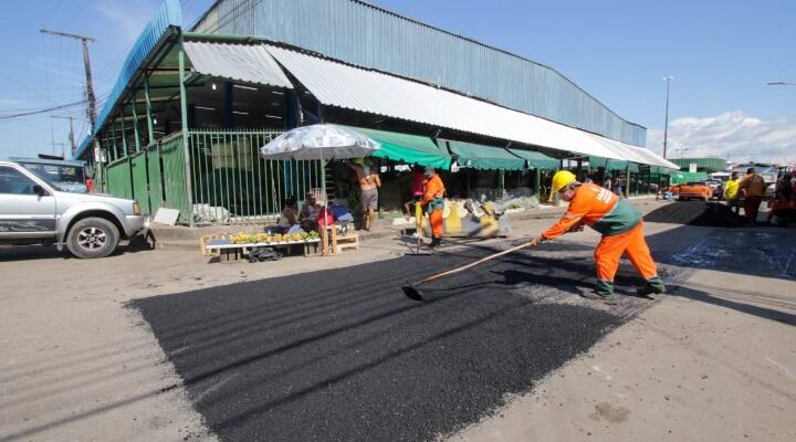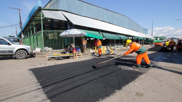Os serviços são realizados por 40 servidores de três Distritos de Obras da Seminf, que fizeram a limpeza da área e atuam, inicialmente, aplicando 30 toneladas de massa asfáltica na via, próxima à feira da Banana.