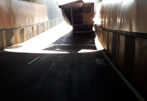 O motorista de um caminhão-baú foi multado na tarde desta terça-feira, 14/7, por agentes de trânsito do Instituto Municipal de Mobilidade Urbana (IMMU), por trafegar em um veículo com dimensão superior à permitida para a passagem subterrânea da avenida João Valério, em direção à avenida São Jorge, no complexo viário Ministro Roberto Campos, zona Centro-Sul de Manaus. O caminhão-baú bateu no limitador de altura implantado no acesso à passagem e mesmo assim tentou seguir viagem.