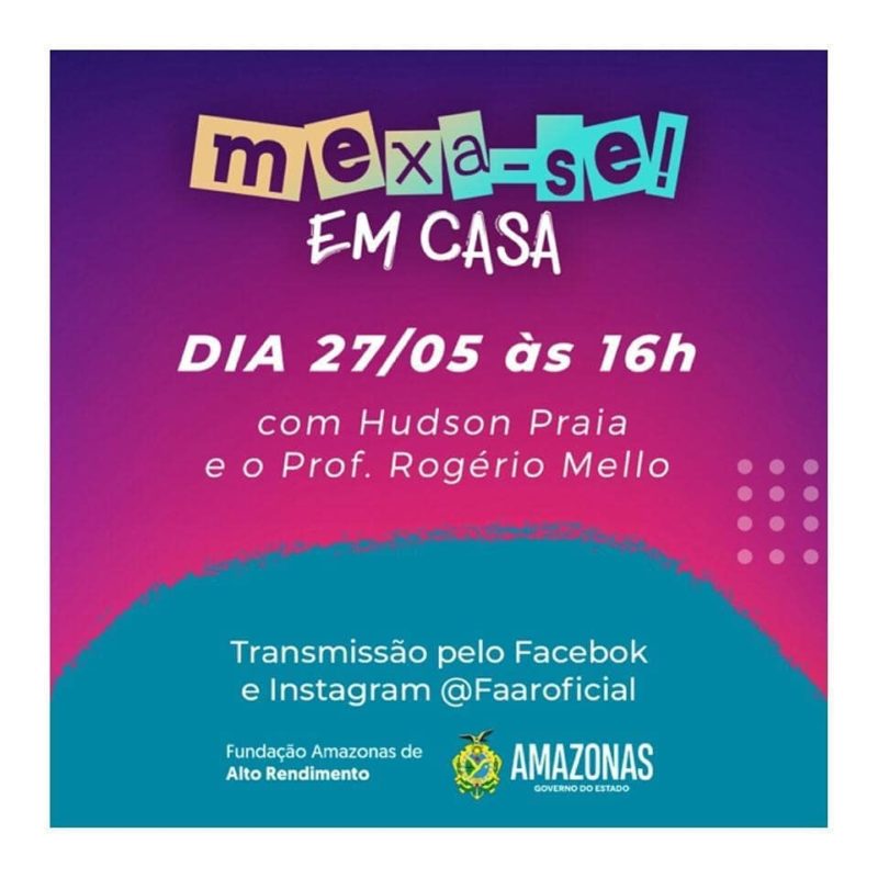 Realizado pelo Governo do Estado, por meio da Fundação Amazonas de Alto Rendimento (Faar), o projeto “Mexa-se em Casa”, que leva atividade física à população por meio de lives nas páginas oficiais da Faar no Instagram e Facebook, vai promover um aulão de ritmos com o dançarino Hudson Praia, a partir das 16h desta quarta-feira (27/05). Essa edição do projeto terá ainda o professor de Educação Física, Rogério Mello, que fará o alongamento no início e no final da atividade.