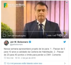 “Nessa semana apresentarei projeto de lei para: 1 – Passar de 5 para 10 anos a validade da Carteira de Habilitação; 2 – Passar de 20 para 40 pontos o limite para perder a CNH”, postou o presidente.