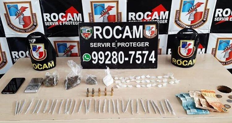 De acordo com a Rocam, a equipe estava em patrulhamento de segurança na área do Alvorada II e se deparou com os dois homens em atitude suspeita no local. Após abordagem, durante revista pessoal, com eles foram encontrados uma pequena porção de cocaína, três porções médias de maconha, 17 pequenas porções também de cocaína, uma balança de precisão, 10 munições calibre 380 de uso permitido e R$ 324,50 em espécie.