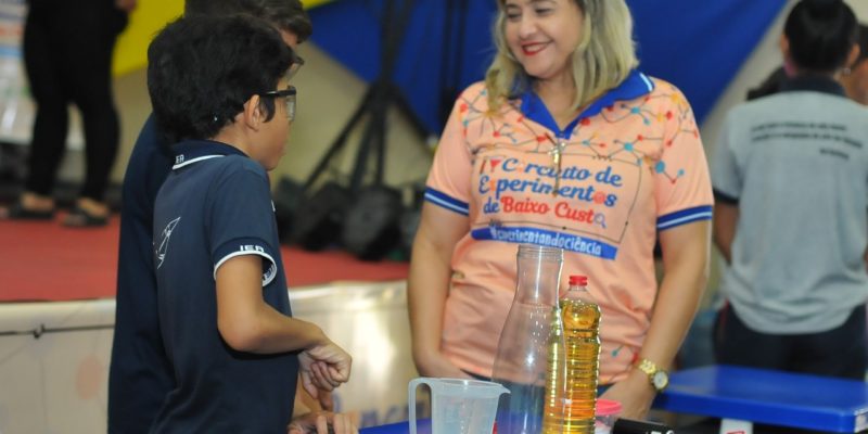 Expositores – Durante o lançamento do 4º Cebac, diversos alunos da rede estadual expuseram experimentos encabeçaram a lista de destaques da 3ª edição do Circuito, realizada em 2018. Os estudantes Edson Vincente e Paulo Henrique, do Instituto de Educação do Amazonas (Iea), por exemplo, exibiram um abajur de lava alternativo. Para criá-lo, a dupla precisou apenas de óleo, água, corante, lanterna, comprimido efervescente e recipiente transparente. “Nós fizemos uma pesquisa em casa e discutimos sobre essa ideia durante um dia, até decidir seguir em frente com ela. Depois, a gente só precisou ir atrás dos materiais”, contou Paulo.
