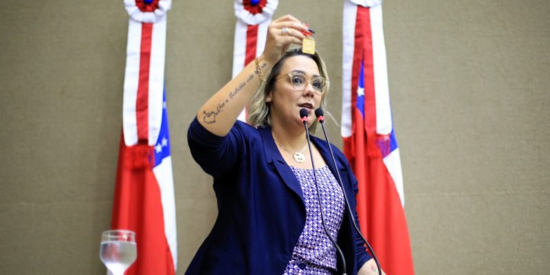A comenda foi entregue à titular da Seped pelas mãos dos deputados Belarmino e Mayara, e da secretária Inês.