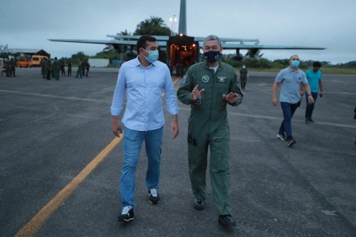 O governador Wilson Lima acompanhou, nas primeiras horas desta quarta-feira (13/01), a chegada da primeira remessa de isotanques de oxigênio, na Base Aérea de Manaus, para abastecer a rede estadual de saúde. Os insumos estão sendo transportados, ao longo da semana, pela Força Área Brasileira (FAB), da cidade de Guarulhos (SP) para a capital, e devem totalizar 22 mil metros cúbicos de oxigênio.
