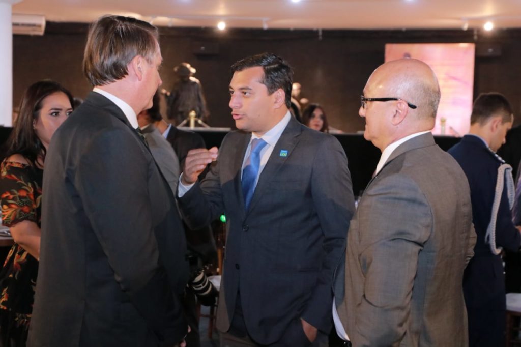 O governador Wilson Lima recebeu no começo da noite desta terça-feira (26/11), no aeroporto de Ponta Pelada, na base da Força Aérea Brasileira, em Manaus, o presidente da República, Jair Bolsonaro, que veio ao Amazonas para a abertura da Feira de Sustentabilidade do Polo Industrial de Manaus (FESPIM), nesta quarta-feira (27/11), no Studio 5 Centro de Convenções, na zona sul de Manaus.