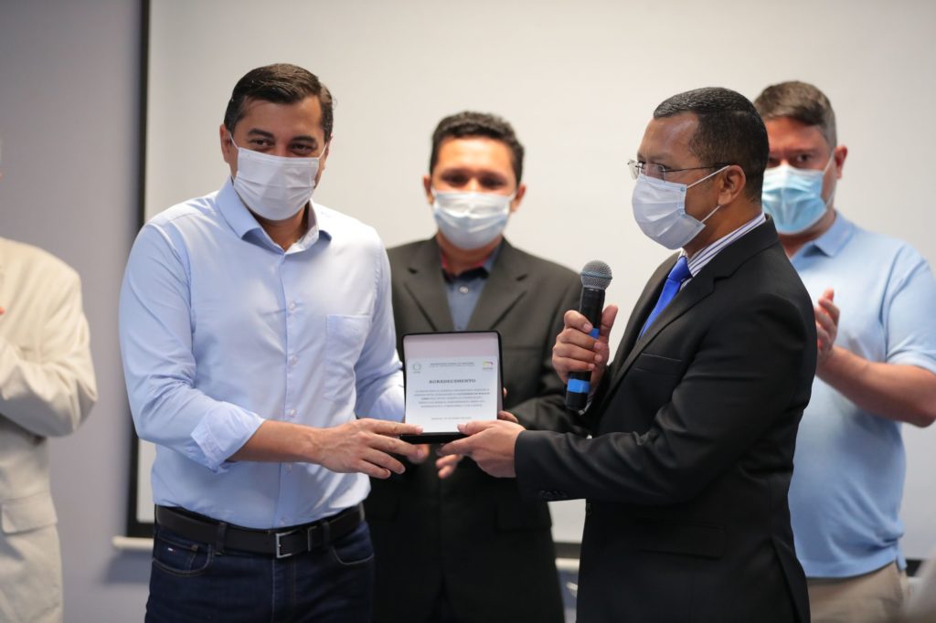 Homenagem – Durante a visita ao Francisca Mendes, o governador Wilson Lima recebeu homenagem dos profissionais que foram absorvidos pelo Estado. Na ocasião, eles foram representados pela assistente social Carlete Trassi.